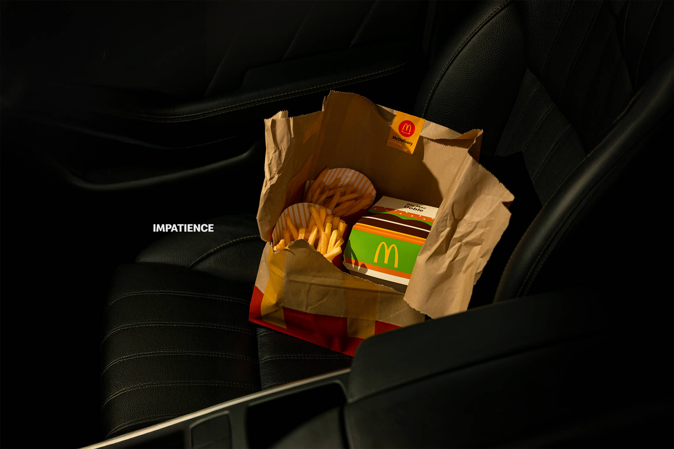 - الفكرة الرئيسية: الإعلان يحتفل بلحظة الاندفاع والشغف التي تنتاب العميل عند وصول وجبة ماكدونالدز المفضلة لديه. الفكرة الأساسية هي أن الجوع والشوق للمنتج يتغلبان دائمًا على الصبر، مما يدفع الناس لاتخاذ أقصر الطرق وأسرعها للاستمتاع بوجبتهم.