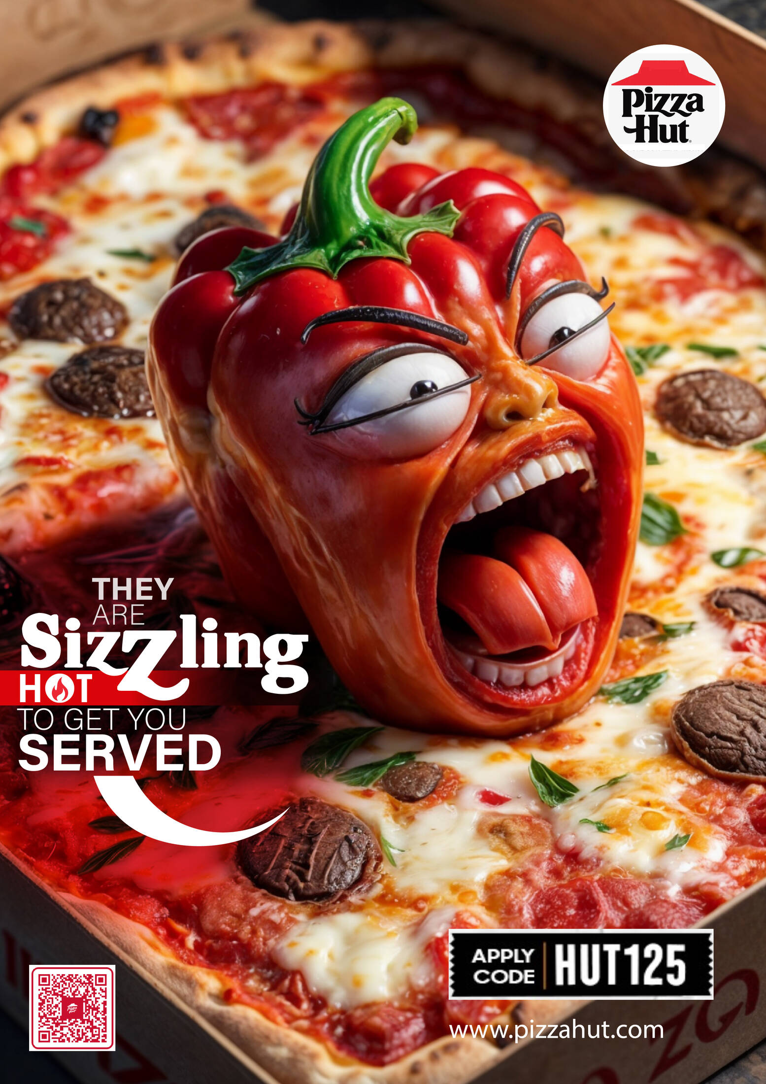 الرسالة: البيتزا في Pizza Hut مليانة مكونات طازجة، مشتعلة بالنكهة والشغف – كأنها نفسها غاضبة عشان توصلك بسرعة.